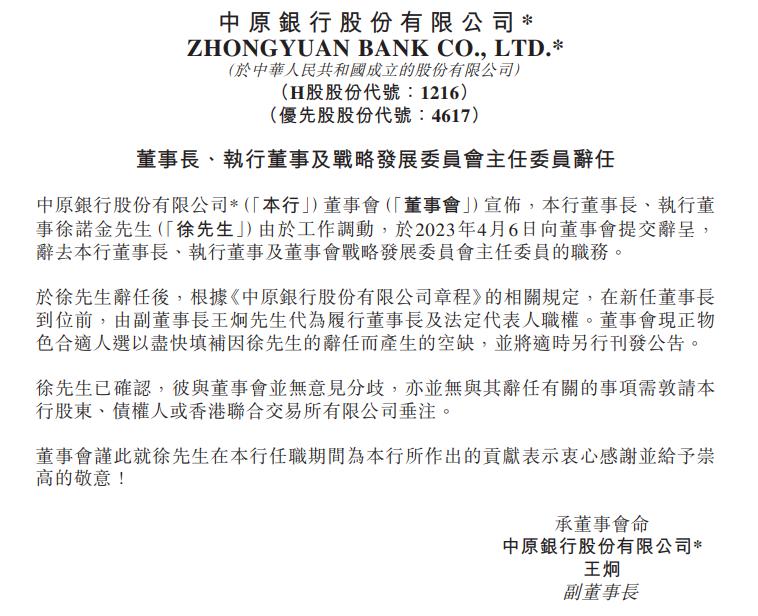 4月6日,中原银行发布公告,该行董事长、执行董事徐诺金先生由于工作调动,于当日向董事会提交辞呈,辞去该行董事长、执行董事及董事会战略发展委员会主任委员的职务。据悉,至此番辞职,徐诺金任中原银行董事长职务接近1年5个月。
