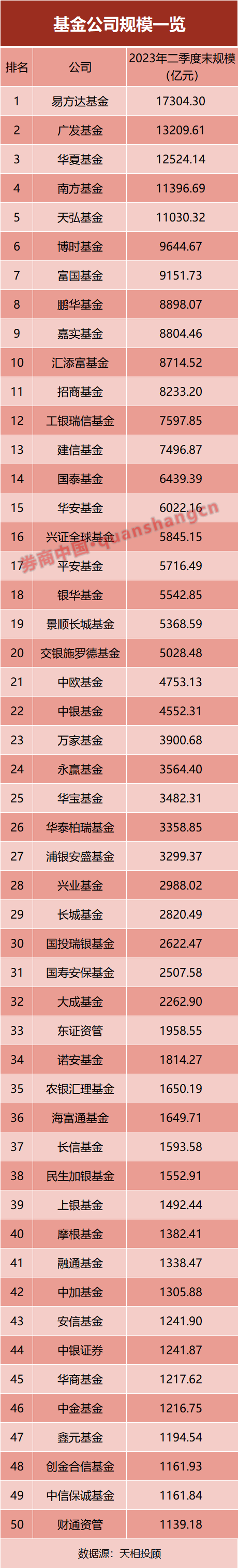 基金公司最新规模排名出炉。