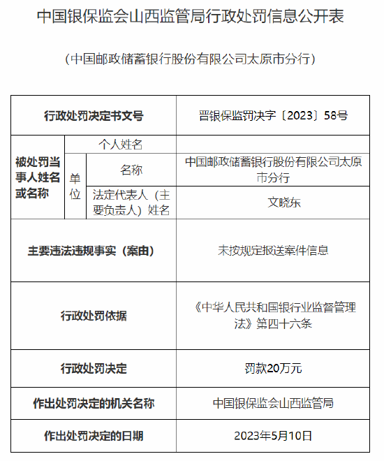 5月19日消息,国家金融监督管理总局网站日前披露行政处罚信息公开表显示,中国邮政储蓄银行股份有限公司太原市分行因未按规定报送案件信息,被处以罚款20万元。此外,中国邮政储蓄银行股份有限公司古交市青年路支行因内部控制不严格,被处以罚款20万元;贾小翠因对该支行上述行为负有责任,被处以警告。...