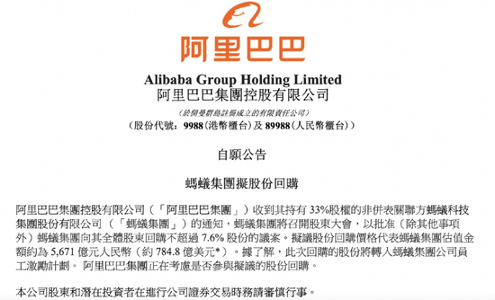 阿里巴巴9日晚间港交所公告称,集团收到其持有33%股权的非并表关联方蚂蚁集团的通知,蚂蚁集团将召开股东大会,以批准(除其他事项外)蚂蚁集团向其全体股东回购不超过7.6%股份的议案...