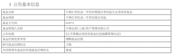 中泰证券(上海)资产管理有限公司发布基金经理变更公告,中泰红利价值一年持有混合发起(014772)、中泰红利优选一年持有混合发起增聘基金经理王桃。