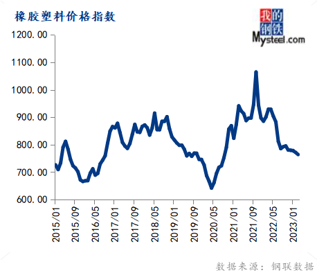3月份橡胶塑料价格指数为763.88,环比下跌1.02%,同比下跌17.79%。