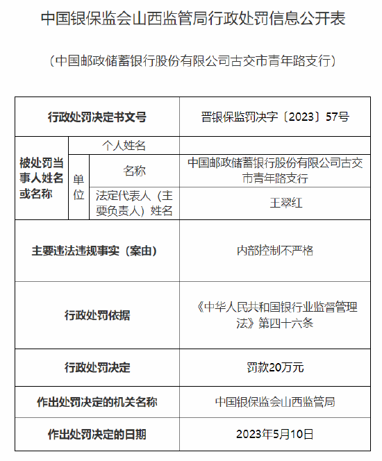 5月19日消息,国家金融监督管理总局网站日前披露行政处罚信息公开表显示,中国邮政储蓄银行股份有限公司太原市分行因未按规定报送案件信息,被处以罚款20万元。此外,中国邮政储蓄银行股份有限公司古交市青年路支行因内部控制不严格,被处以罚款20万元;贾小翠因对该支行上述行为负有责任,被处以警告。