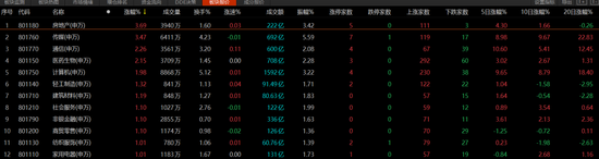 盘面上,31个申万一级行业中25个行业板块收涨,仅6个行业板块收跌。房地产、传媒、通信、医药生物、计算机等行业板块涨幅居前,轻工制造、建筑材料、社会服务、非银金融等行业板块跟涨。