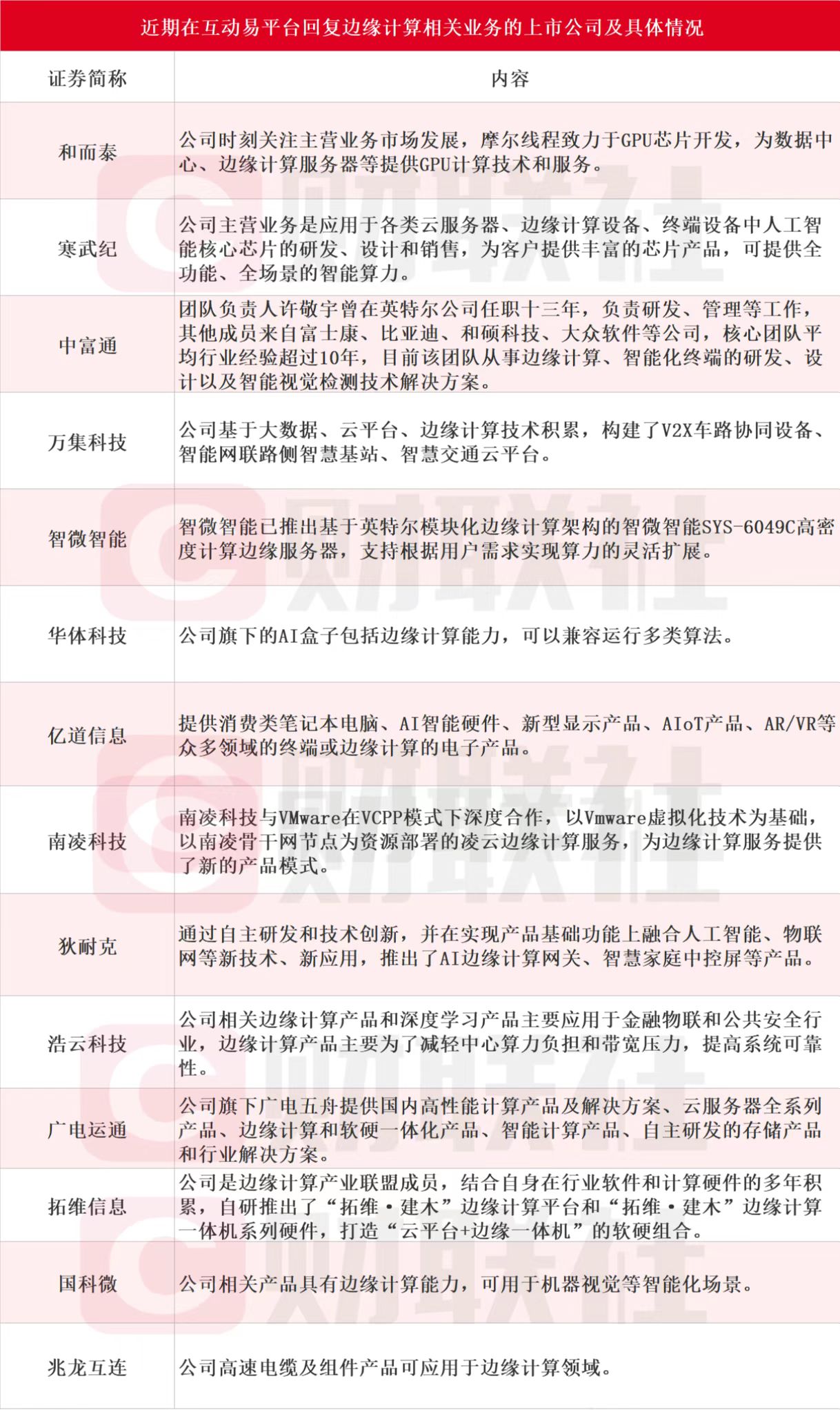 此外,据财联社不完全整理,近期在互动易平台回复布局边缘计算相关业务上市公司还包括和而泰、寒武纪、中富通(300560)、万集科技(300552)、智微智能、华体科技(603679)、亿道信息、南凌科技、狄耐克、浩云科技(300448)、广电运通(002152)、拓维信息(002261)、国科微(300672)、兆龙互连等。