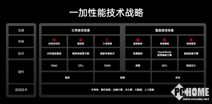 一加在场景、体验、软件、硬件以及底层技术等方面进行了完整的布局。其中,半导体、操作系统、边缘计算、云计算、大数据以及人工智能等根技术领域的布局,是整个性能技术战略的能力底座。在此基础上,一加以“流畅铁三角”和“游戏铁三角”为核心,整合硬件以及软件领域的各项子技术,致力于为用户在日常使用和重度游戏两大场景下,打造快、省、久、顺、稳、清的极致体验。